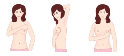 - 검진하려는 쪽 유방의 팔을 머리위로 올린 상태에서 반대쪽 손의 세 손가락으로 유방을 젖꼭지에서 바깥쪽으로 원을 만들면서 촉진해 나갑니다.